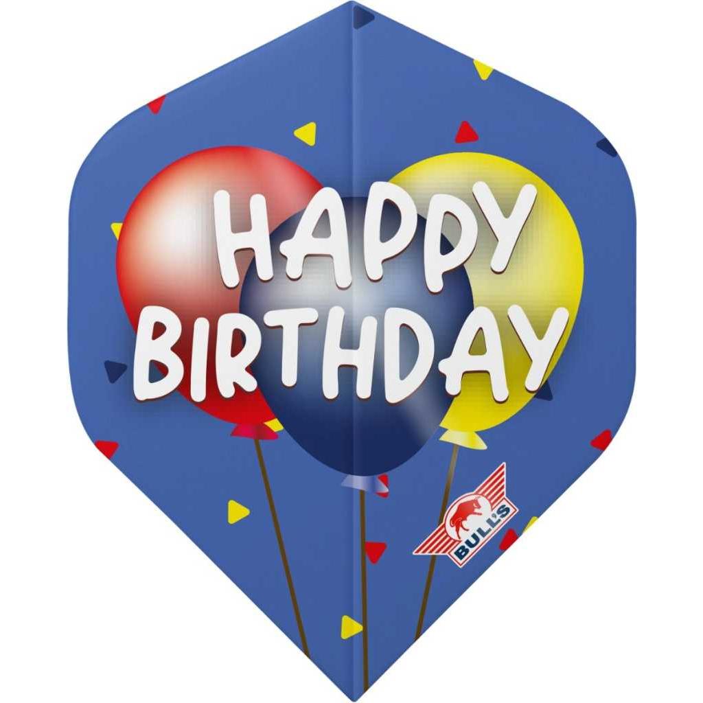 Bull's NL Powerflite im Happy Birthday Design. Diese Flights haben das passende Design für ein Geburtstags-Geschenk oder für die Geburtstagsfeier. Die Flights sind aus Kunststoff und haben eine Stärke von 100 Micron.