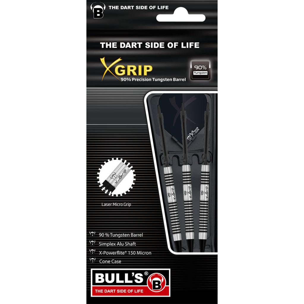 Verfügbare Varianten: 18g Der Barrel in herausragender 90% Tungsten Qualität wird mit der neuesten Micro Laser Technologie hergestellt. Alle Barrelvarianten verfügen über spezielle Griffzonen, die dem Spieler eine perfekte Kontrolle über den Dart ermöglichen. Der X5 hat ein langes gerades Barrel mit Ringed Grip im mittleren Bereich und zusätzlichen Griffzonen mit dem besonderen X-Grip im vorderen und hinteren Bereich. Erhältlich in drei unterschiedlichen Gewichten und Längen. Mit eingraviertem BULL'S Logo und X-Grip Schriftzug. Im handlichen BULL'S Cone Case mit Simplex Aluminium Schäften und dem neuen extra starken X-Powerflite. Barrelmaße: Länge= 52,1 mm D1= 5,6 mm D2= 5,9 mm.